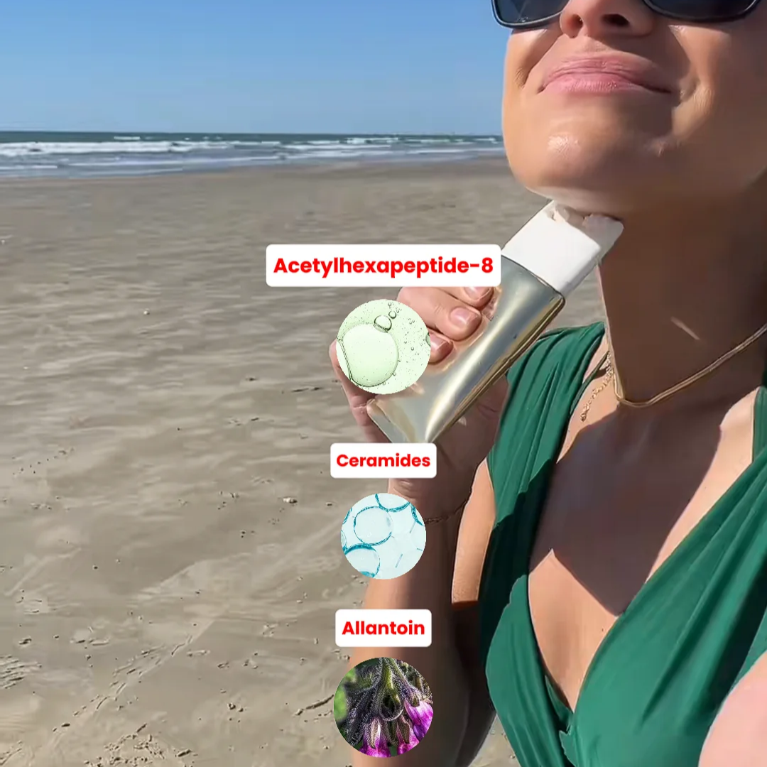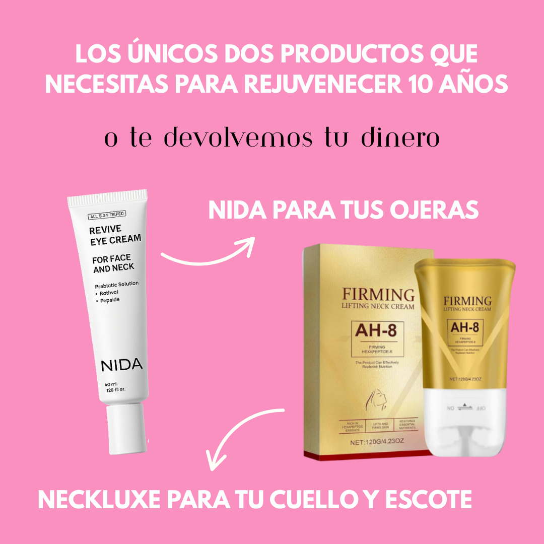 NeckLuxe™ combina activos clínicamente probados con un masajeador que activa la microcirculación y redefine el contorno. Un tratamiento completo para rejuvenecer tu cuello desde casa, sin dolor ni gastos estéticos.
